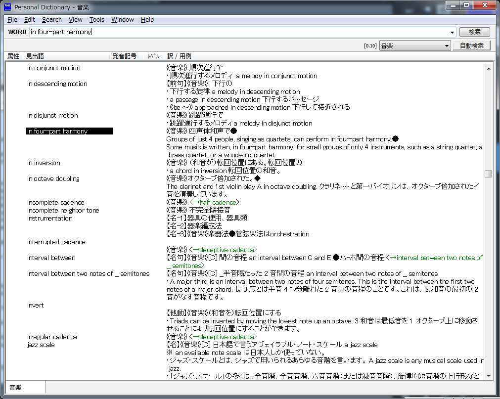 (2) こちらも自作辞書。音楽用語を入れてあります。新しく覚えた単語や表現を忘れないようにすることと同時に、定訳がある場合、専門用語は勝手に翻訳できないので、それを記録しておくためにも大切です。